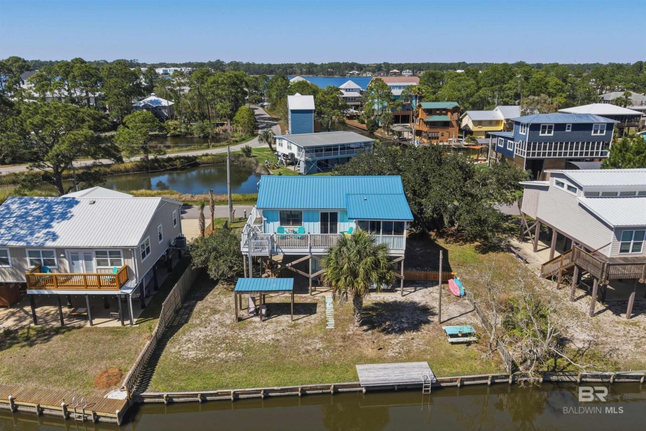 Raised beach cottage in the heart of Gulf Shores on a quiet street with easy bike access to the beach. Property overlooks a coastal canal leading to Little Lagoon and includes a private bulkhead with water views from most areas.Main level offers 3BR/2BA with open kitchen and living area. Kitchen opens to a newly constructed screened porch with ceiling fan. Separate laundry room with hookups. Spacious front deck provides panoramic coastal views.Ground level features a finished bonus space with HVAC, cabinetry, granite countertops, and farmhouse sink ideal for entertaining, cookouts, or fish cleaning. Private dock suitable for small boat or kayaks. Covered outdoor sitting area adds additional space to relax.Buyer to verify all information during due diligence. Buyer to verify all information during due diligence.